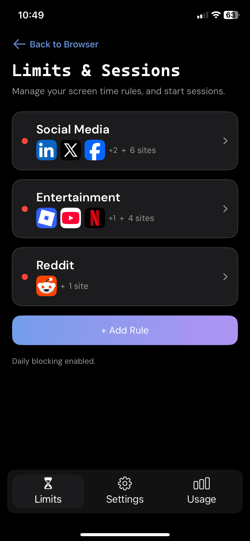 Our browser is built on top of the privacy-sensitive and open source DuckDuckGo browser. It offers powers no other screen time app offers, like blocking subdomains.